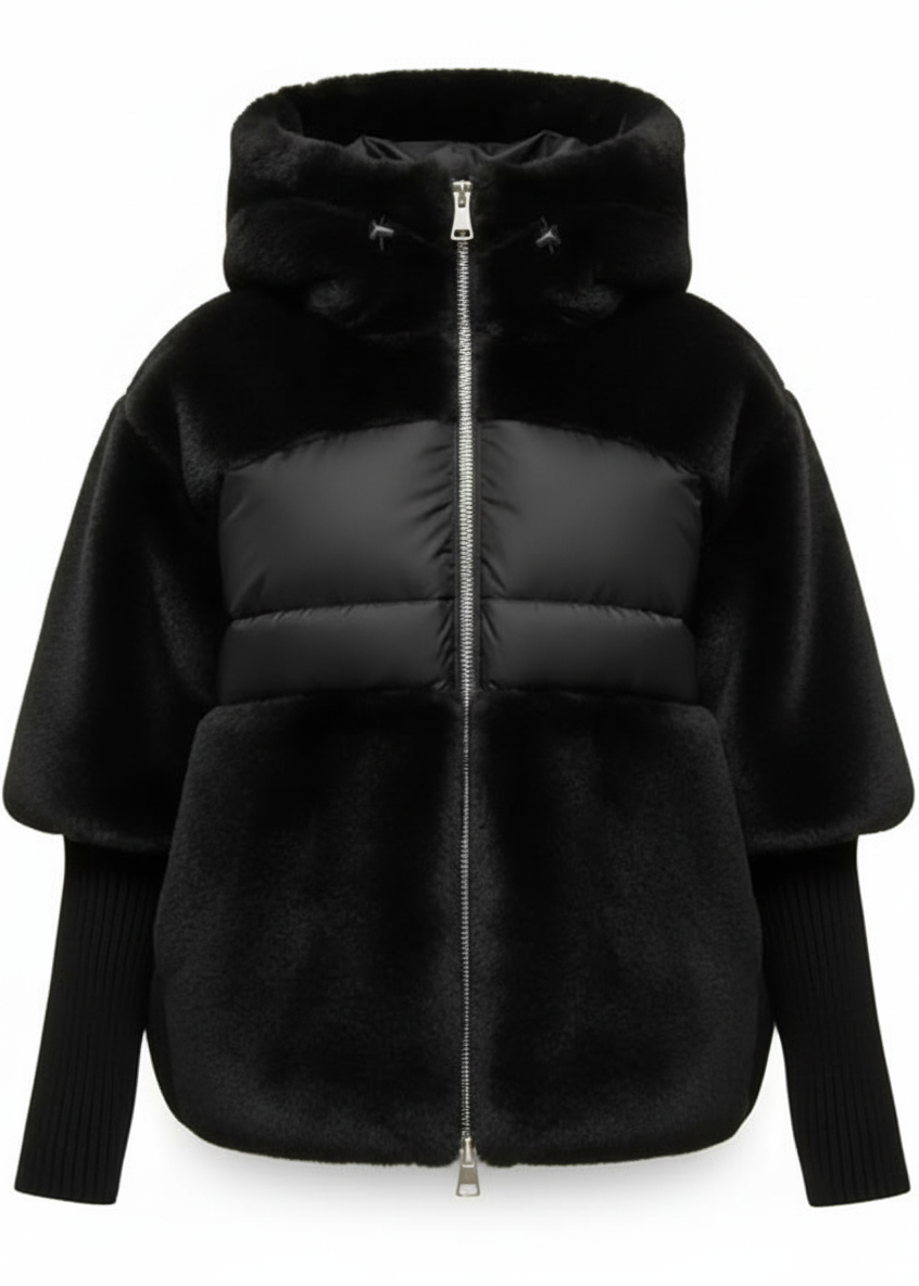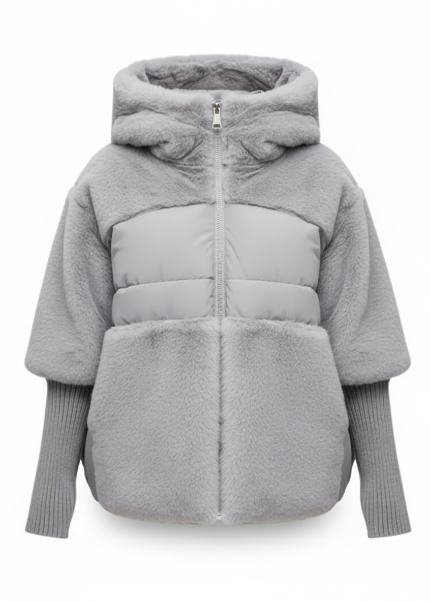 El abrigo destaca por su diseño patchwork, que mezcla materiales cuidadosamente seleccionados para aportar textura, profundidad y un acabado sofisticado. Incluye capucha integrada, ideal para proteger del viento y la lluvia ligera, y puños acanalados que retienen el calor y evitan la entrada de aire frío.