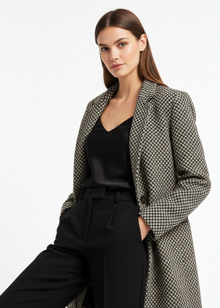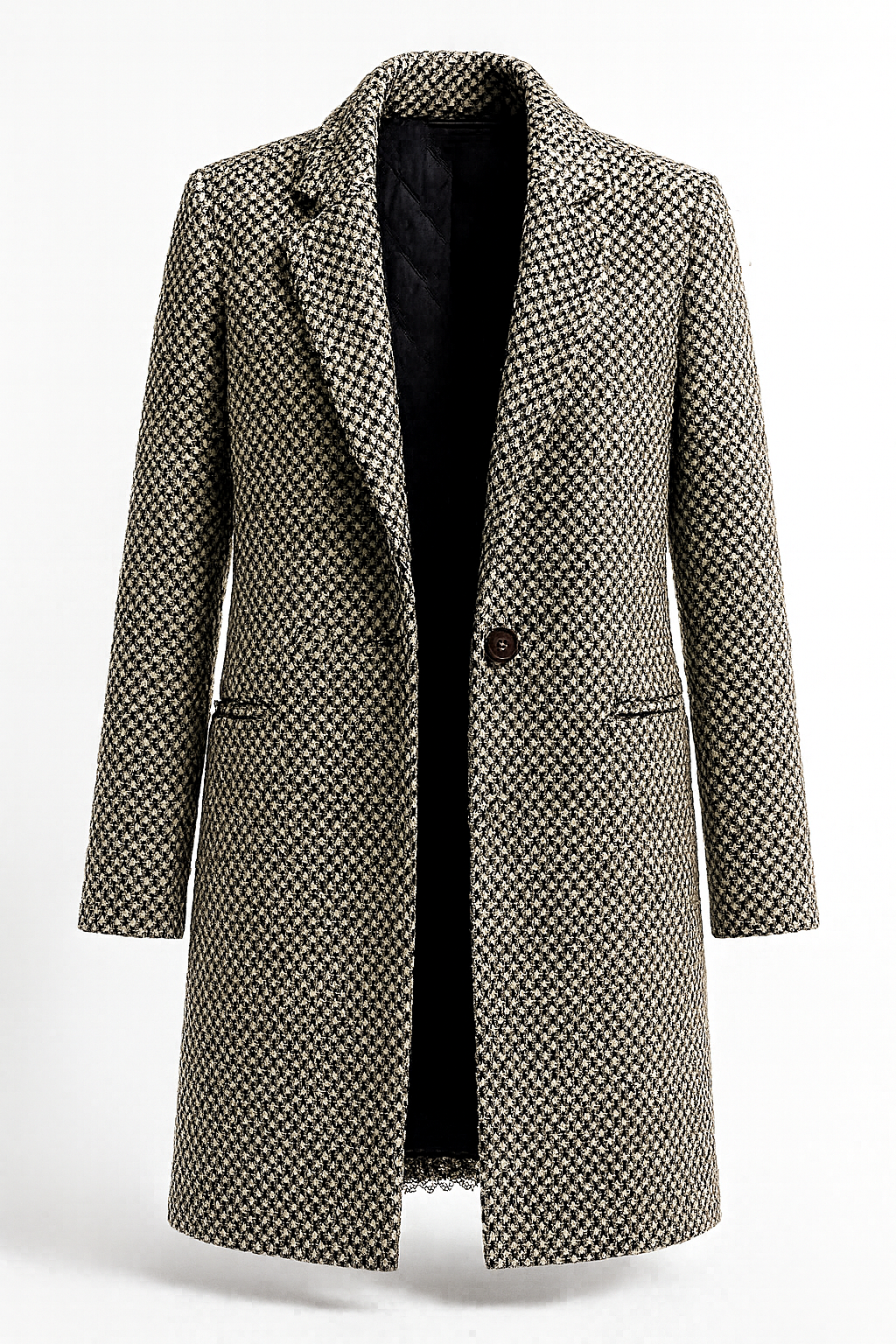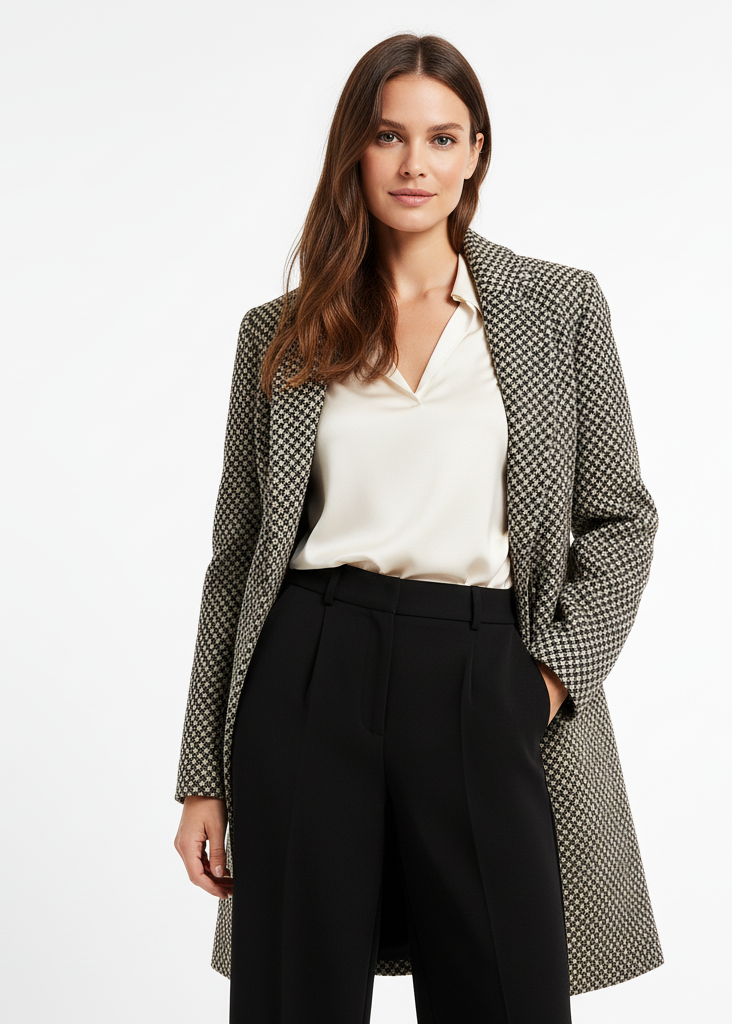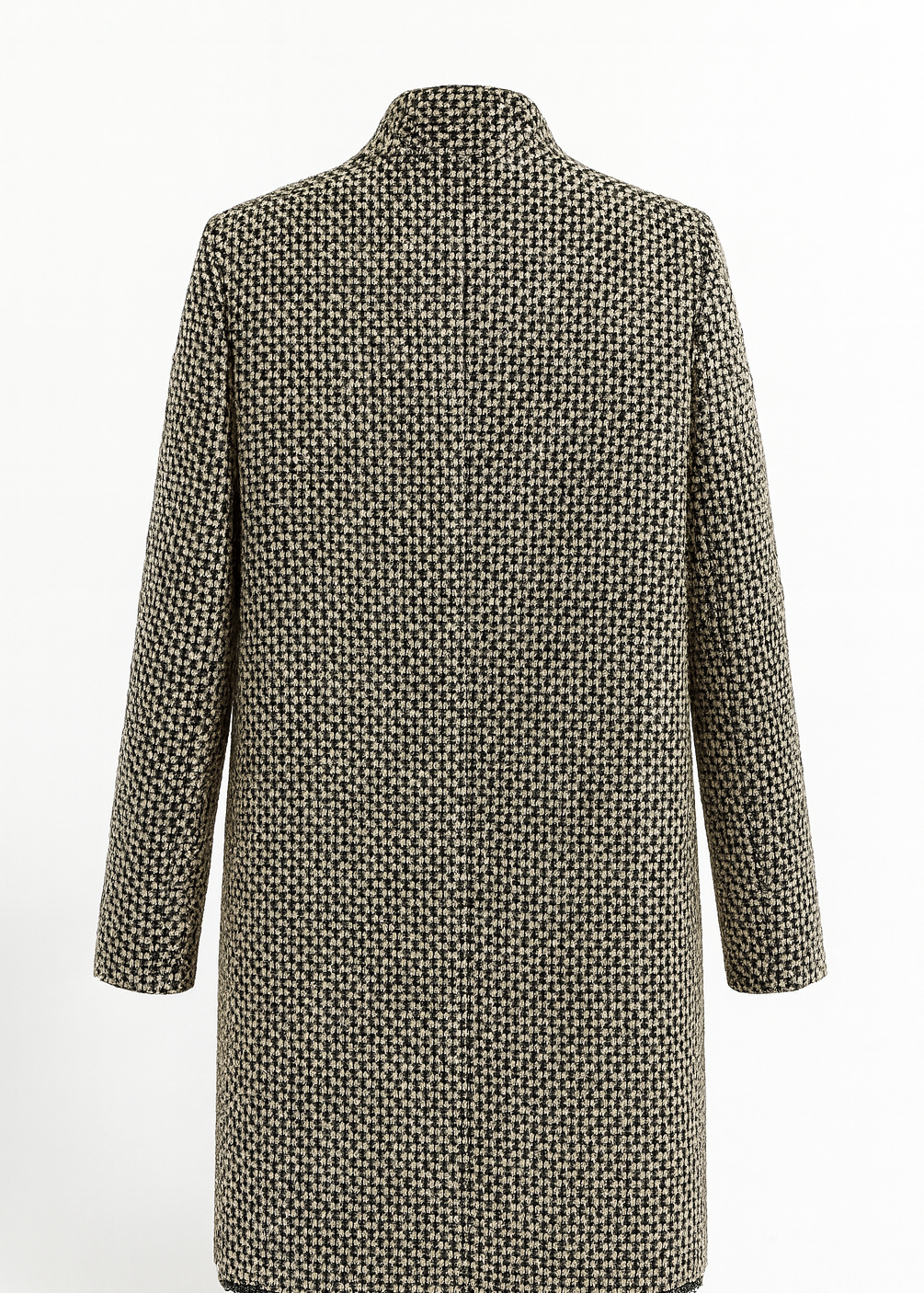 Su patrón refinado y su silueta estructurada están pensados para favorecer todo tipo de cuerpos: tanto figuras delgadas como curvas o atléticas encuentran en este abrigo un aliado que realza la figura con elegancia natural. Un imprescindible para elevar cualquier look con un toque femenino irresistible y un aura de auténtico lujo.