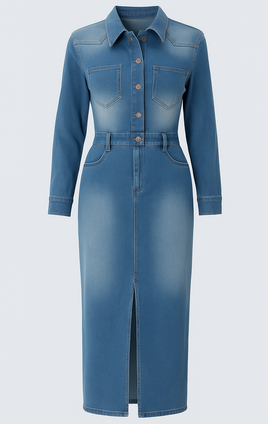 Un vestido que redefine el denim con un aire de elegancia natural.