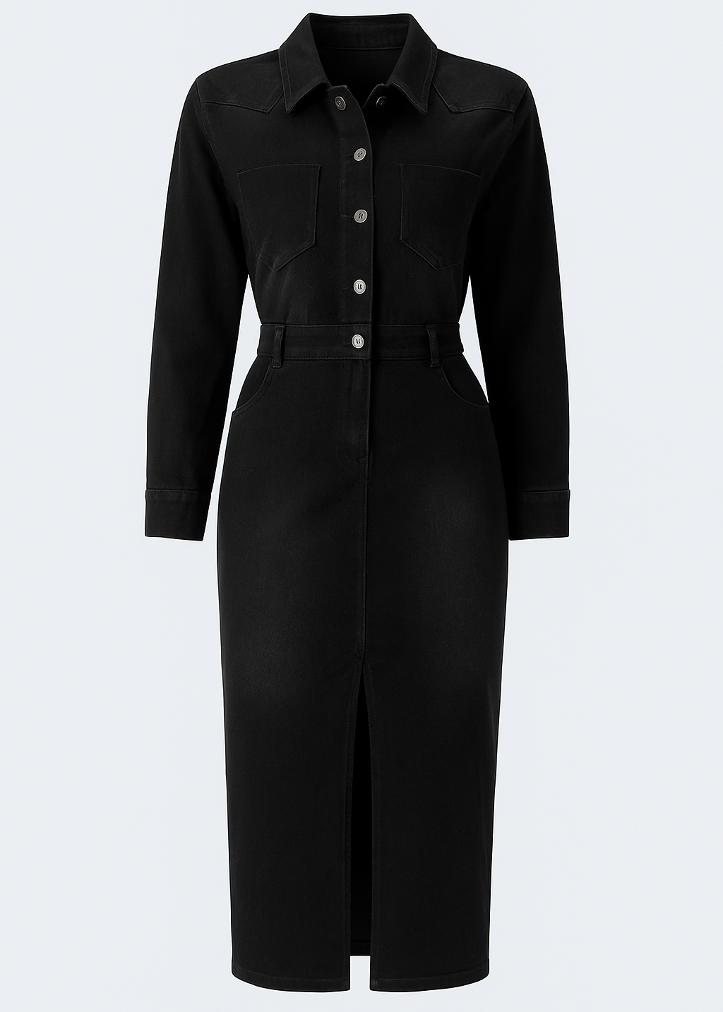 Modernidad y elegancia se fusionan en este vestido denim de corte midi, diseñado para destacar con estilo y comodidad. Su silueta entallada realza la figura, mientras que los bolsillos frontales y el detalle de abertura en la falda aportan un toque contemporáneo y funcional.
